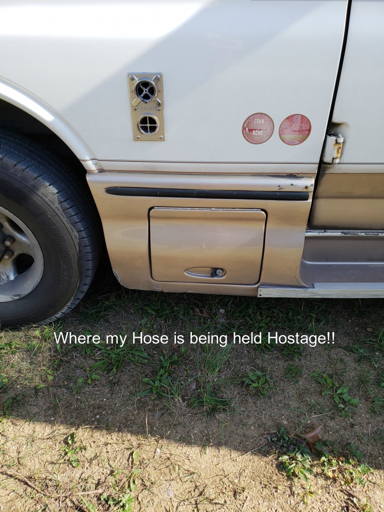 About a month ago I had tried to open the compartment where I had put my hose. It is an awesome hose. One of those expandable ones, you know the kind, they expand when filled and shrink as you empty them. It was the perfect van size really. It was flexible and compact. There is a small compartment in the “basement” that really does not fit much. But it fit this hose perfectly!!! Right on! Perfect! Right up until I could not get it open. My friend says maybe you are using the wrong key?? Really???? HAHAHA! No right key as I did try all of them but the tumbler is broke inside. So do I drill the lock out to get my hose? Not before I have a new tumbler to replace it. Can not have that door flopping all over the place when I am driving. So I need to get another hose. It was on my list! Honest!! HAHA! Sometimes I want to smack me. But it seemed since then everytime I had to fill up I was somewhere with a hose or with someone who had one!