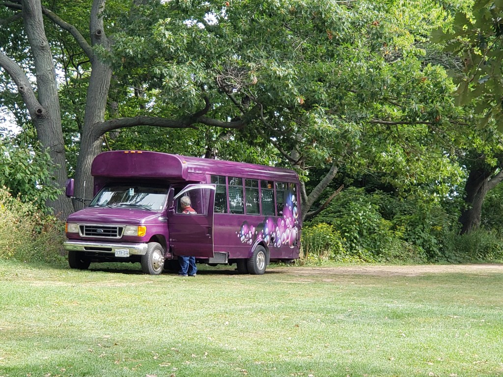 One park I go to near my main office has some interesting people come through. I met this gentleman with this oh so cool Purple Bus! He was a local gentleman and had customized this bus for pleasure travel. His situation had recently changed he decided he was selling his business, renting out his house and going to Florida for the winter. He would see where the wind carried him from there!! OHHH That is AWESOME!! We chatted for a little while and he gave me a tour of his bus. Very interesting man. Very Cool Bus!!