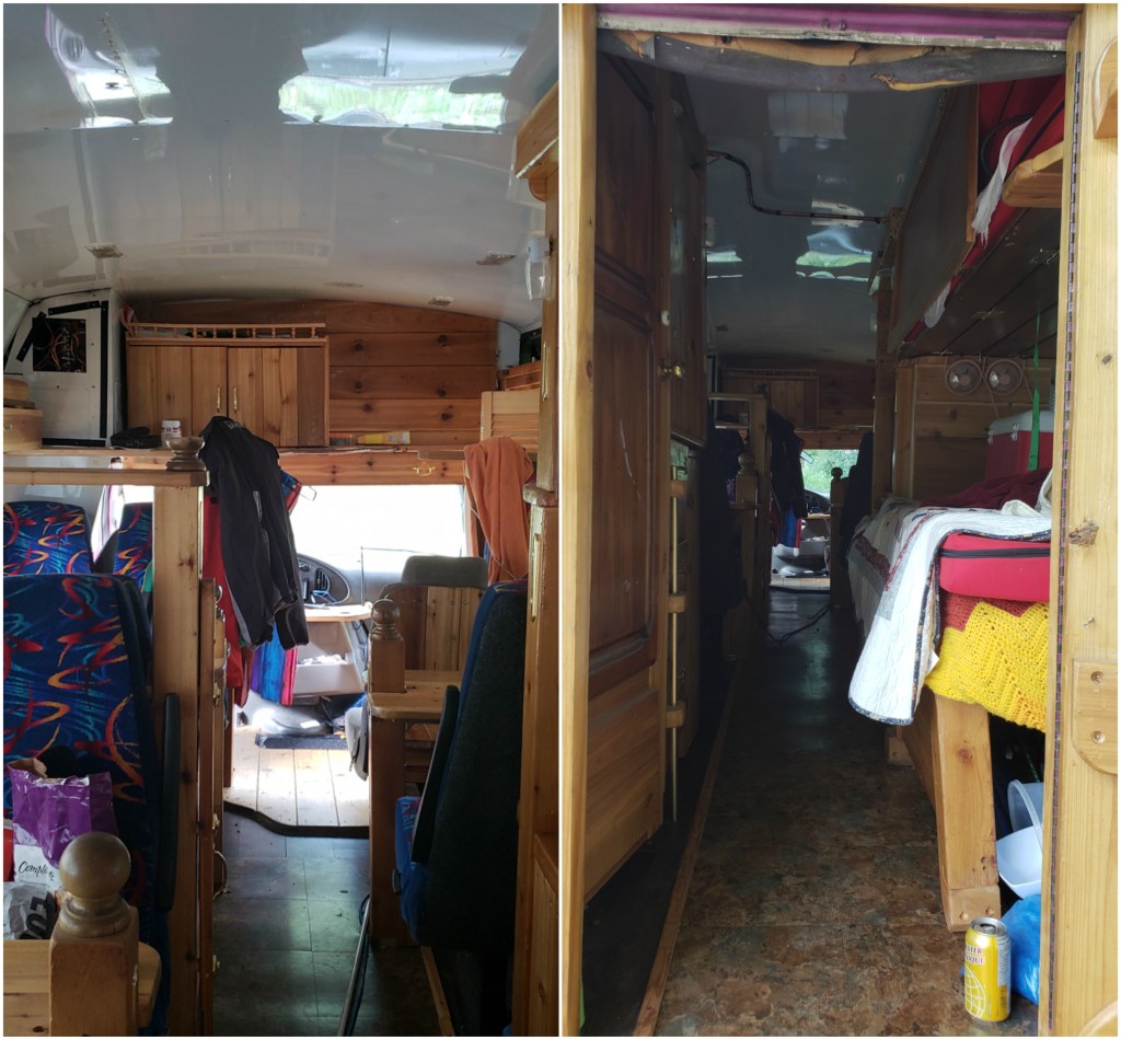 The bus was done in all wood and sat about 12 people. The slats above the seats unfolded to create bunks. Neat!!