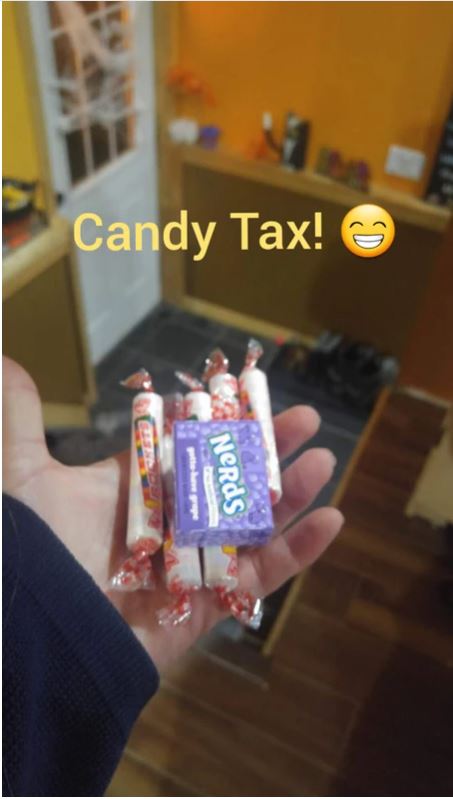Halloween night is for the kids. Everybody, but me, even the dog gets dressed up and goes trick or treating! It’s fun and there is always a Grandma candy tax! I get all the rockets! Smarties to my American friends!!! Lol!