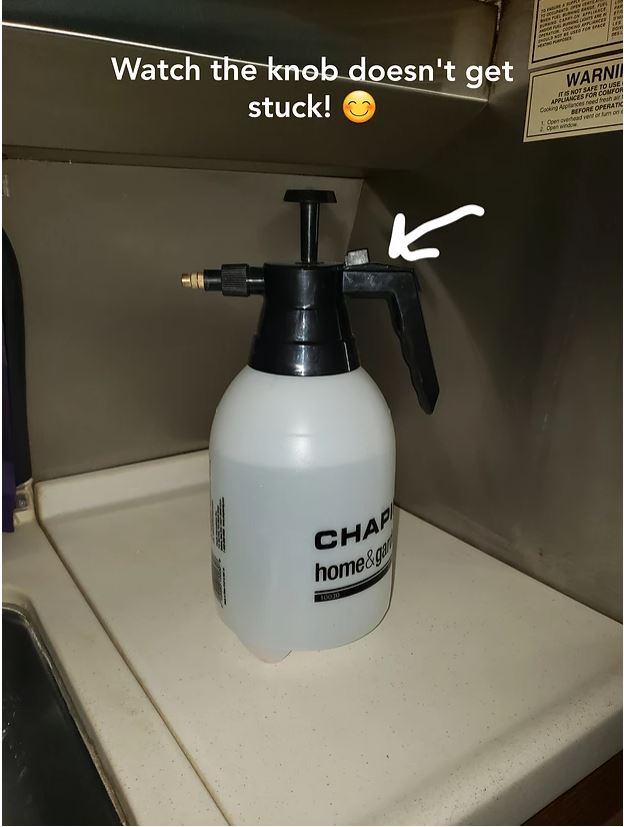 Because Running water!! Ohhh that excites me. Come November usually I have to drain and winterize my tanks. That’s 5 months without running water. Now I can survive obviously but man….its inconvienient! I carry 3 -4 1 Litre jugs in the winter. 2 in the running water season. Lol! They take up space and I am constantly refilling them, tripping over them! It’s a PAIN!! John showed me this little trick that he got off a guy on YouTube that saves a lot of water. It’s a spray bottle that you would use for fertilizer or weed killer. It has a small spray area so it does not soak everything and is relatively small for storage! Small is good! Be careful of the little knob at the top, if it gets stuck on, you have water mayhem!!! Lol!