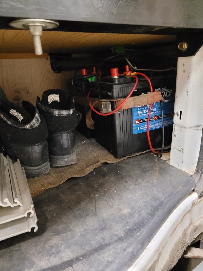 They drilled down through the floor ran a wire between the batteries and within an hour I had 3X the power and still have room for my hiking boots!! Woohoo!