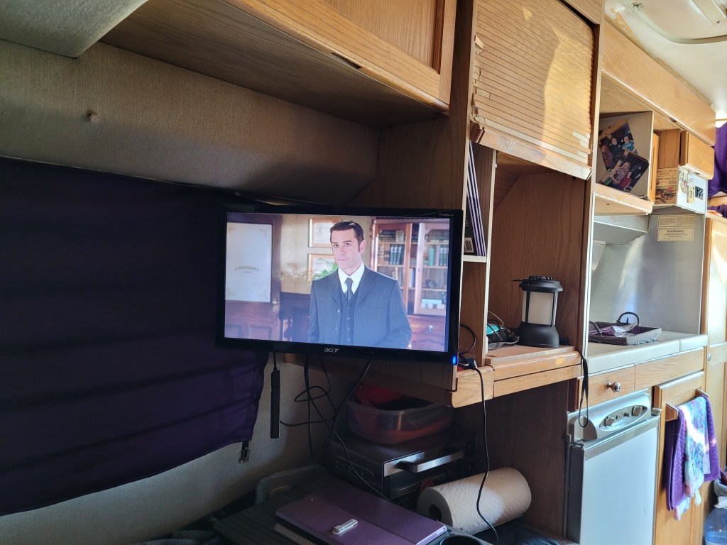 Talking with Tom and Kim I thought about buying a small smart tv with a firestick and mounting it on the side of the cupboard. But the smallest I could find at a reasonable price was 32″ that was too big as the width of my cabinet is only about 16″. They did have a 24″ but it was way over priced and still too big. Tom had an old acer 18″ monitor that would be compatible to a firestick. All I would need would be a small folding mount and we could set it diagonal to the cabinet. I could pull it out straight when I was sitting and leave it diagonal for when I am laying in bed. Oh thats perfect!!
