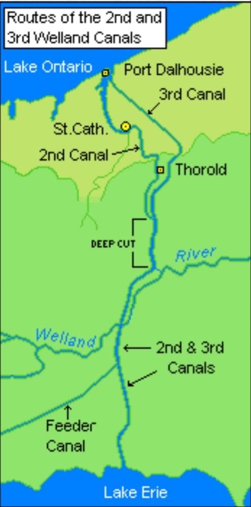 The first Canal began construction November 24, 1824. It took 5 years to build and was opened Novemeber 29, 1829. The first route started in Port Dalhousie, ran along 12 mile creek to Port Robinson where it connected into the Niagara river and flowed out to Lake Erie. In 1833 the Canal was extended to Gravely Bay now known as Port Colbourne. By the time it was complete total cost was $8 million, a mighty sum in those days. It consisted of 40 wooden locks, 110′ long by 22′ capable of lifting a ship up to 125 tones. Horses and oxens were used to tow the ships between locks in those days and took many hands to work the gates. It was a mighty task.