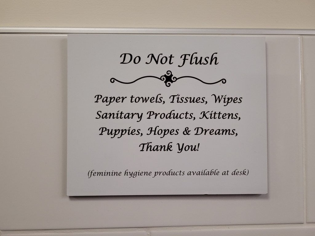 As we drove we could see clouds building. There has been a hurricane in the south earlier in the week and although it had weakened considerably they were still calling for heavy rain. We decided to seek shelter. After a quick stop at the Best Western Plus in Chocolate Lake, Halifax we found most of the city sold out. I used the bathroom while we were there and this sign was on the wall. It made me giggle as growing up in the country on a septic system you had to watch what you flushed!