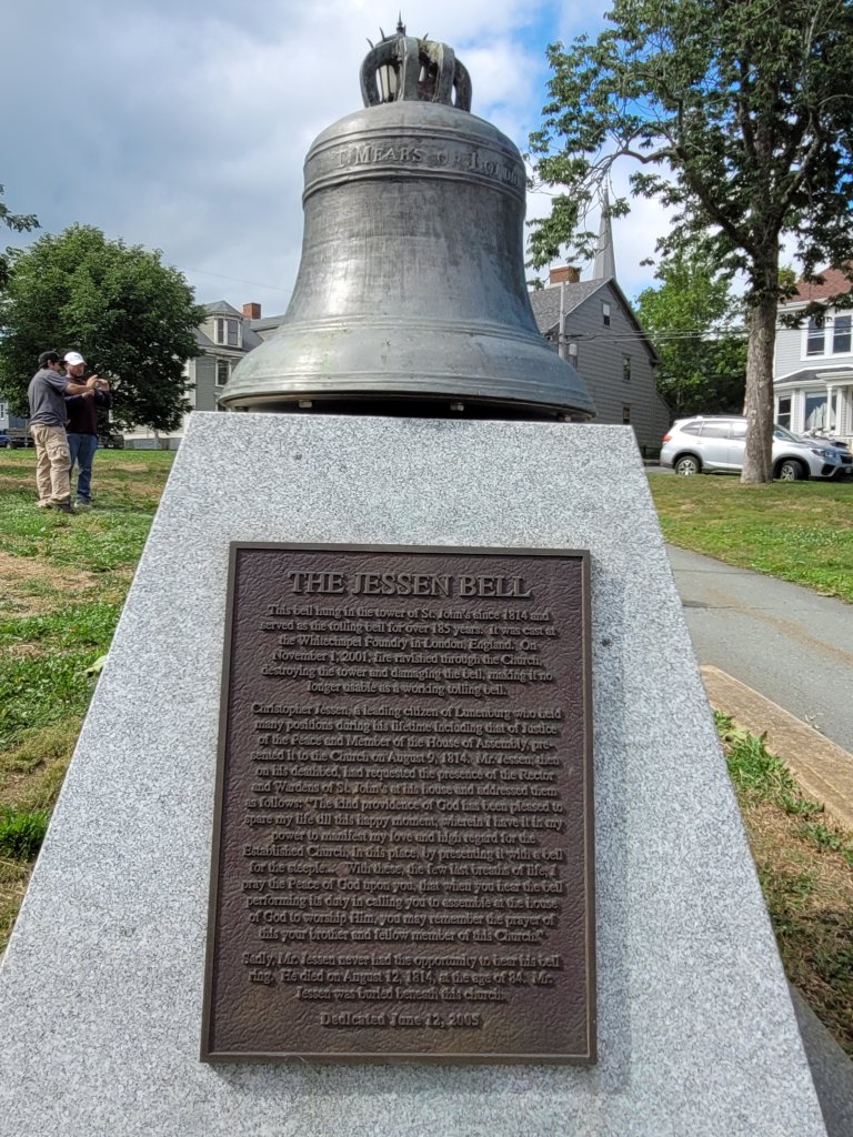 This bell manufactured at the Whitechapel Foundry in London England hung in the tower of the church since 1814 and rang its beautiful melody for 185 years. Christopher Jessen was a prominent citizen in Lunenburg and donated the bell in 1814 to the church while on his death bed. Sadly he passed at the age of 84 before he could hear it ring. Interestingly Mr. Jessen is buried under the church. So maybe he did hear it ring. In the 2001 fire it was so damaged it could not ring any longer. It is now a monument in front of the church to be remembered. It was an interesting story of a bell that tolled for 185 years. Oh the changes it has seen and the stories it could tell.