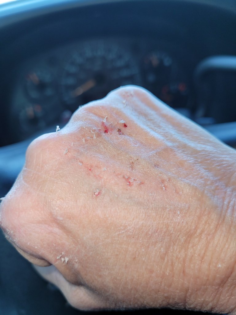 As I am laying under the van in the parking lot trying to delicately put the tie around the hose and the wires without knocking the dirt onto my face, a gentleman comes along and asks me if I need a hand. He startled me as I did not see him coming, I jumped and the back of my hand slammed into the bottom of the dirty van cutting it and raining a pile of road yuck on me. I politely said no and thanked him. I did not even swear when I cut my hand. I am so proud of me sometimes.