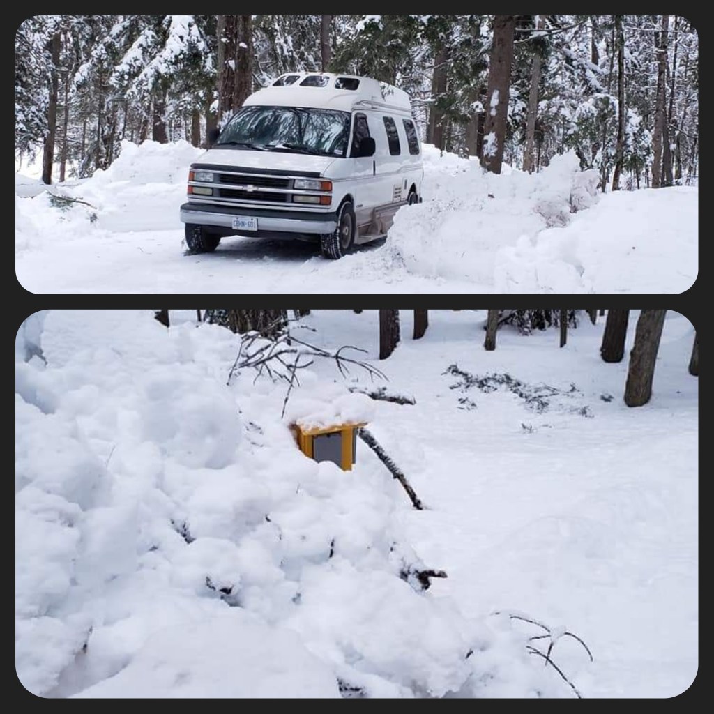 There a few Ontario parks open in the winter. The Pinery near Grand Bend,  Silent Lake near Peterborough, Mew Lake in Algonquin Park to name a few. You can go to their website to get all the fun details. Some have yurts which is an interesting structure and looks very warm and comfy. I had never seen them before. It is like a large heavy canvas, round heated tent. Some of the parks have electical spots which is convenient for running my space heater. I can run off my batteries but being plugged in I know I will not have to get up and start the van. Although I must say I have not had to do that since I put in the extra batteries two years ago. Now finding the power pole can sometimes be a little challenging. In the north there is a lot of snow. Like oh man this is a lot of snow kind of snow. Lol!