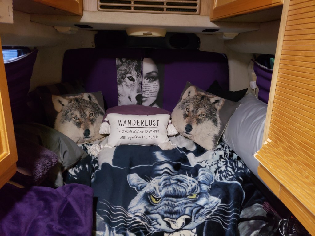 With the temperatures dropping I do my usual things. Put plastic on the bottom of the windows by the couch and bed, double up on my blankets, and I will also hang a blanket closer into the house portion of the van to keep the heat more centralized to my living area. The foam puzzle floor also helps insulate the floors along with my bath mats but as the temperature drops into minus double digits I still need slippers.