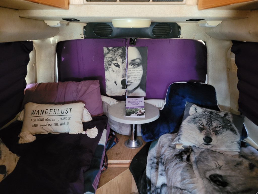 This year I changed the interior from a king size bed to a couch and single bed. Creating a work space as well as opening up the back to give myself a little more living room. One thing I did not realize was how much it was going to impact the temperature in the winter. There is a lot more floor for the cold to come up from the bottom. With the king size bed up the floor in the aisle way is covered by boards, couch pads, a foam mattress and blankets. I would also put body pillows along the walls and back doors to keep the cold from seeping through the wall. With this design I cannot do that. I also installed a bistro table at the back so I cannot put a body pillow along the back doors. I am finding it a lot draftier and colder in here than previous years.