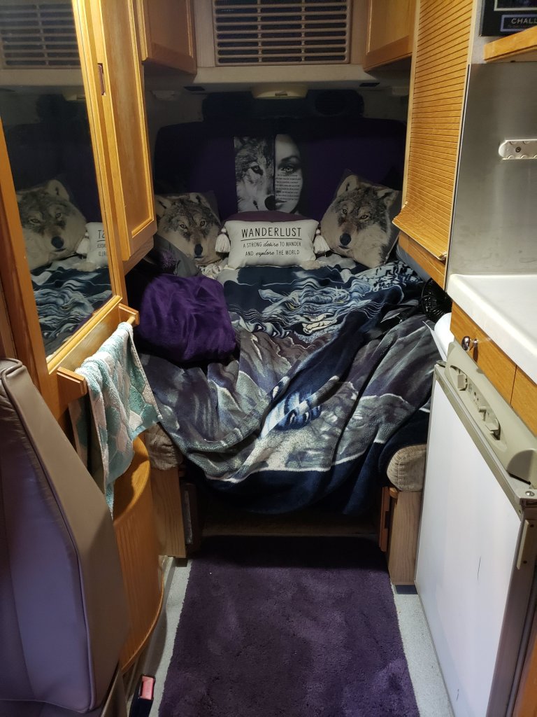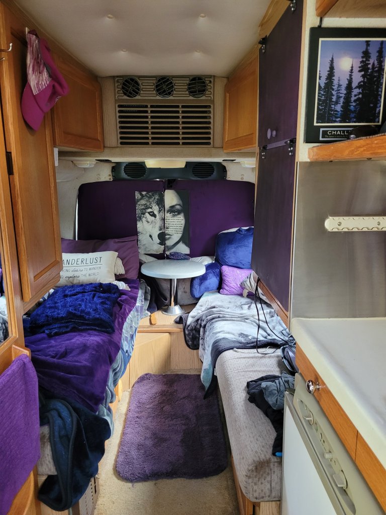 When I bought her she was a little old and used like me. A few changes definitely needed to be made. I decided that I would take the back and make a king sized bed. It would give me protection from the cold floor and a nice big sleeping space. I could sit on the bed and work or relax or turn the passenger seat at the front and use it as a recliner. The old curtains would certainly have to go as they provided no protection from that north wind coming through and were stained with years of age. The metal floor in front of the counter I would line with bath mats to keep my feet a little warmer in the winter and a little cooler in the summer. With a little help from my friends and my daughter’s sewing skills, within a couple of months she looked like a whole new van. Warm and comforting , from brown and a little worn to purple and nice and fresh.