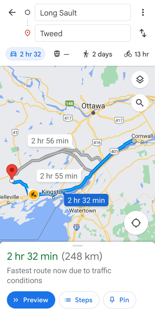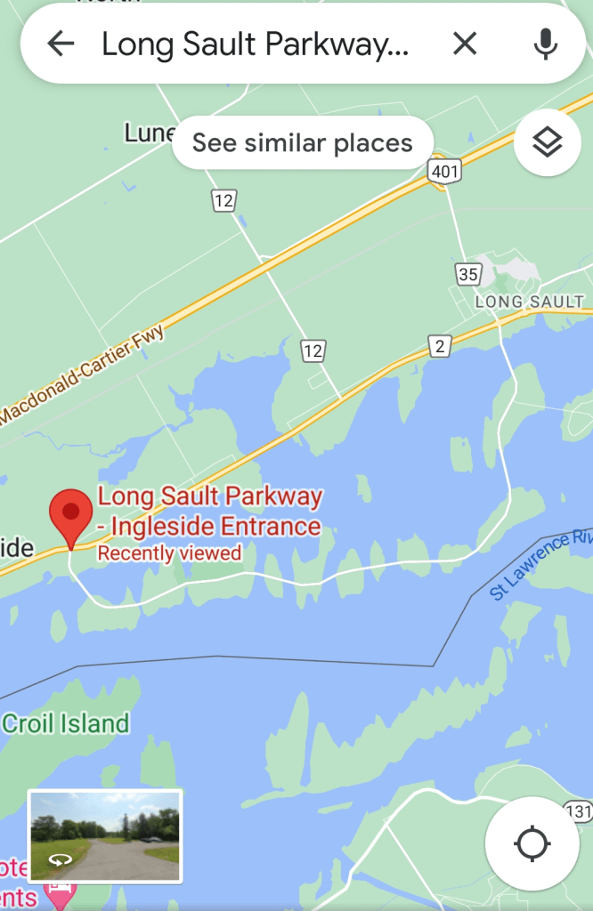 Doing this I also found the Long Sault Parkway. A scenic route that takes you across 11 different islands in Ontario. I thought you could only do that in the keys in Florida. Just a little further down the road so it sounds like it is worth the detour. If I am not sure of road conditions, sometimes it says it is a road but really it is a path. I will do a street view to look around.