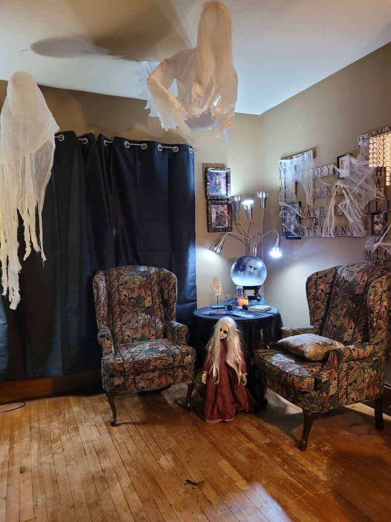 I cannot talk about Halloween without mentioning my girlfriend Diane. She is a Halloween freak. Her house becomes a frightful adventure at Halloween both inside and out. It is so much fun. Some of the kids will not even go into the living room because the creepy girl is in there. Ok, yup she is creepy. My grandson Jensen who is 2 1/2 years old walked into the living room and the little girl turns on. She has glowing eyes and a creepy little voice. His reaction…he tried to share his chips with her. Hahaha! That will make her all better. Lol. Do not forget to look on the floor as you walk or you may just get grabbed by the 1/2 a doll crawling across the floor or the eyball that is rolling by. All of the creepy toys coming at you are triggered by a sensor when you come close. Be careful when you look into the coffin because you never know what will pop out.