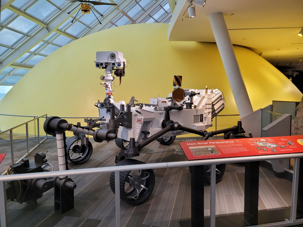 They had exhibits of different crafts that have flown through space. I loved the Mars Rover they had on display. This full scale model is of the Mars Rover that landed on Mars February 18, 2021. It will gather samples, looking for “ancient fossilized microbial life” on this desolate planet. As it gathers, it will put it into tubes and leave it in a designated spot for a future mission to Mars to pick up and bring back to earth for further study. It is a cool looking machine.