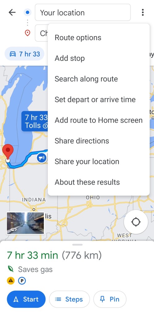 In your route options, you can avoid, toll roads, ferries, and motorways (highways) for those backroads road trips. Be careful it does not take you on a road that is not travelable. Always make sure that your RV can travel safely down the roads it is directing you on. You can add a stop that is on your way and find gas stations, restaurants, or picnic areas by pushing the microphone and asking Google for “gas stations on my route.”