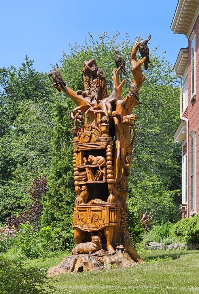 A beautiful, intriguing wooden sculpture sits in the front yard. What looks to be a tree stump is now a magnificent piece of art. When you look closely at the sculpture, it has characters and notions from his books. Cats on the shelf (Pet Sematary), the owl looking from above (The Mist), and the other creatures are all sitting on a credenza with books on the shelf. A breathtaking work of art.