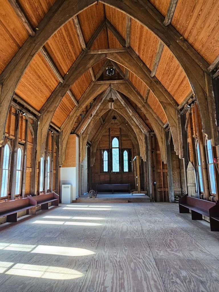 The church is a magnificent building with its board and batten vertical exterior and pointed doorways. The long slim windows in the front give you the feeling you are being watched as you walk up the walkway. Once inside, the vaulted ceilings and wooden trusses are both awe-inspiring and impressive. This church has done some traveling of its own.