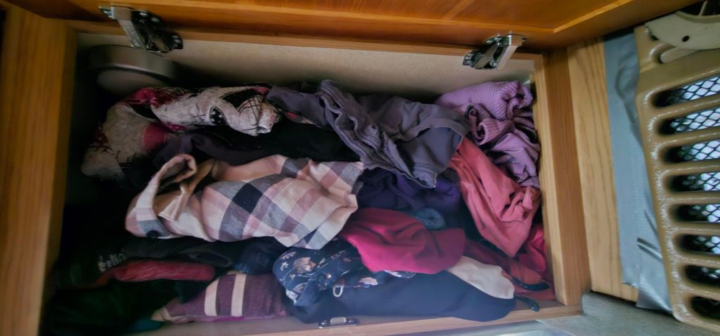 Just because I live in a van-size RV does not mean that I do not deal with clutter. It is so easy to collect things. While you are travelling, you pick up a tee-shirt here, a cute souvenir there, and before you know it, you are moving things to sit down. Tee shirts are a big problem for me. I have to have shirts for all four seasons as well. I have one cupboard, and a few times, it has gotten to the point that every time I open it, a shirt falls out. It is so annoying.