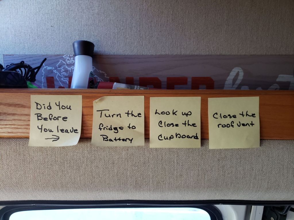 Changing a habit is not an easy task. When I first moved into my van, there were many times I ended up pulling over after the first rounded corner to close something, take my coffee cup off the counter or turn off the propane on the fridge. I did it so many times I ended up putting sticky notes to remind me. I had to develop a routine before driving away.