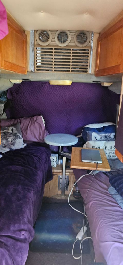 Winter, for me, is a clutter nightmare. With heavy blankets, coats, boots, hats, and a space heater, there is so much extra stuff in the van. I am stepping over things in the hallway. My closet is stuffed to overflowing, and there are so many blankets I can not use my couch.