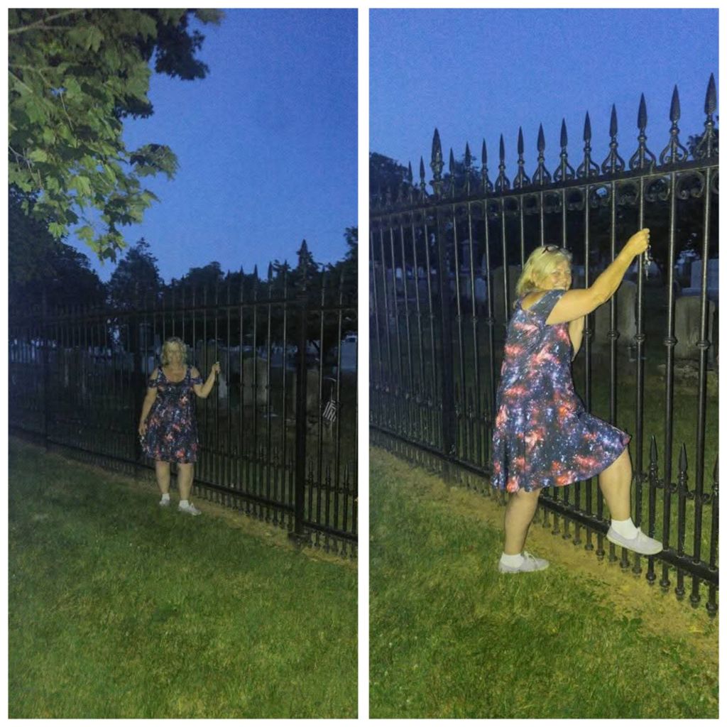 Exploring after dark near a cemetery with high walls surrounding it with my friend Kim, we thought we heard someone behind us. We knew we were alone. There were no other cars in the lot. As we headed back to the van, it sounded closer. Not quite like footsteps, but you knew it was there. We kept looking and could see nothing in the darkness. As we got closer to the unlighted lot, Kim yelled at me to turn and take a picture. The only thing in the picture was a streak of green light in the darkness. There was no green light we could see.