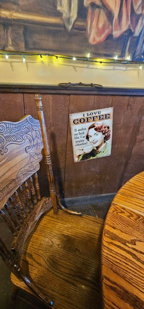 As you walk through the glass doors into a world of rustic elegance. The first thing you notice is the giant murals on the walls, and then you hear a friendly, “Come on in, and have a seat.” Of course, I had to sit at this table. It seemed it was waiting just for me.